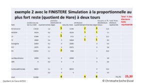 Si Léon Blum faisait campagne pour la proportionnelle en s’exclamant le 20 décembre n 1920: « L’importance de la proportionnelle c’est quelque chose de bien plus haut : c’est une importance morale », on ne peut que constater cette injustice électorale avec une simulation témoin réalisée sur le département du Finistère (8 députés à élire), avec les données des élections de 2024. Avec le scrutin actuel, ce sont 52,08 % des électeurs exprimés qui n’ont pas été représentés, par aucun des huit « représentants de la nation » élus au final. Chiffre qui descend à 25,30 % d’électeurs non représentés avec le scrutin proportionnel au plus fort reste et 5% comme seuil.