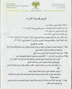 Nos sources en Syrie nous ont fait parvenir les décrets et délibérations gouvernementales, s’appliquant essentiellement au niveau du Gouvernorat de Damas. En effet, dans les autres régions de Syrie, des milices auto-proclamées (Al-Nosra, Daech…) rejettent les décisions de l’Etat et imposent leur pouvoir et leurs règles par la terreur ; la répression sur les populations ne cesse de croître. Dans ces Gouvernorats, il n’y a ni police, ni armée, ni tribunaux nationaux, seule l’anarchie règne et “la loi du plus fort”.