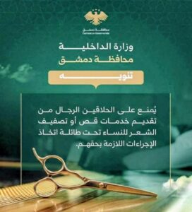 Dans le même temps, le Ministère de l’Intérieur syrien vient de publier un avis visant à interdire “aux coiffeurs de sexe masculin de proposer des coupes ou des coiffures aux femmes, sous peine de sanctions légales”.